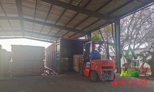 首批“零添加”FSC橡膠木刨光鋸材裝車發(fā)運(yùn)。海墾林產(chǎn)集團(tuán)供圖